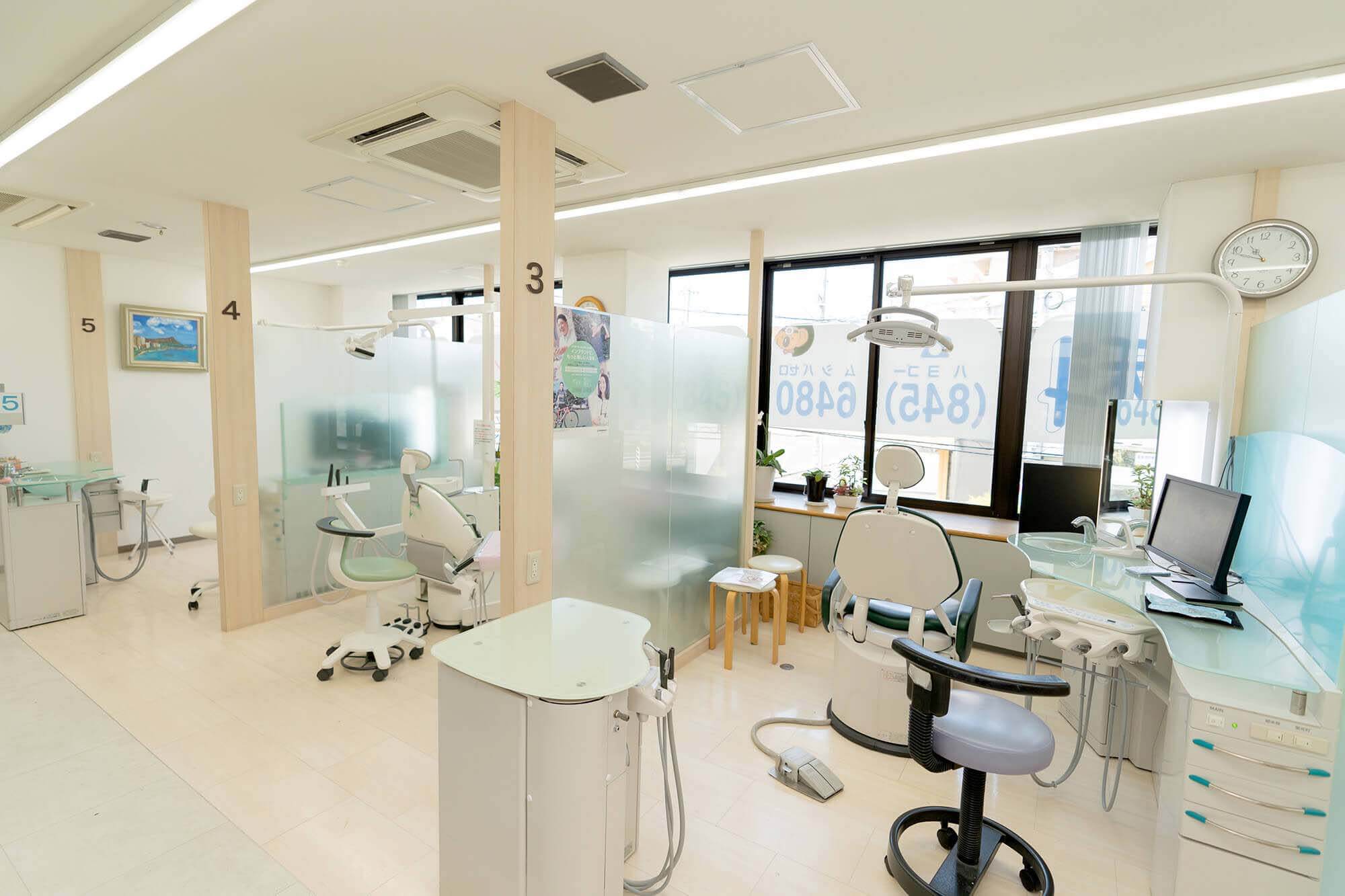 患者さまに快適に診療を受けていただくため、プライバシー保護の観点から改装を重ね、現在では 4部屋の完全個室診療室と、大きなパーテーションで区切った4つの半個室の診療スペースを完備しております。